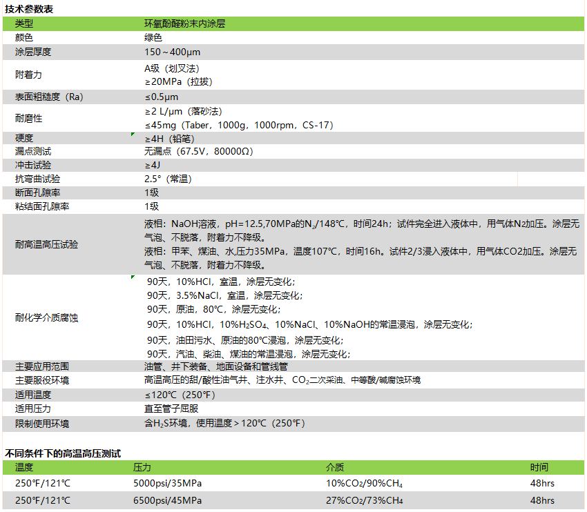 ·具有優異的附著力和柔韌性; ·適用于含CO2、油、水、鹽水和中等酸/堿腐蝕環境; ·表面光滑和具有高光澤,提高流體效率。